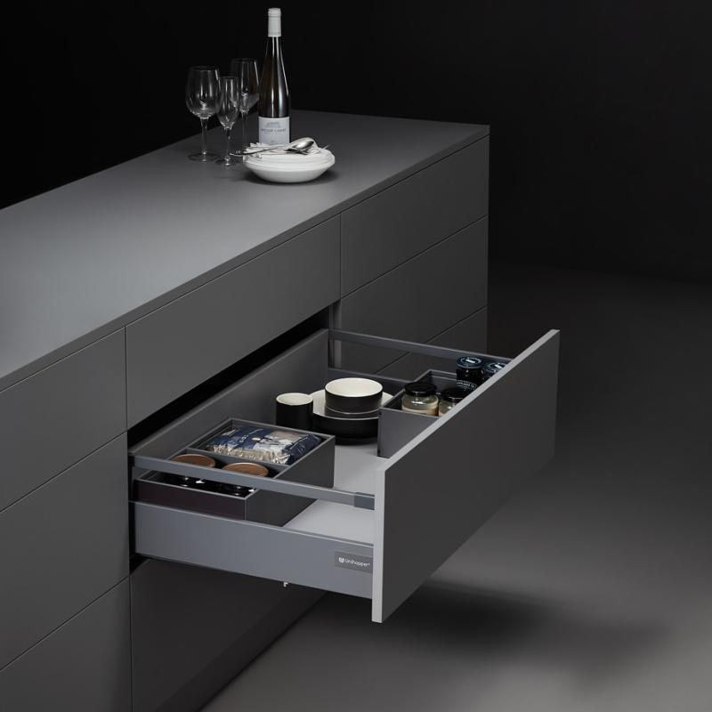 UNIHOPPER MAGIC BOX - это инновационная система выдвижения для стильной мебели с тонкими боковинами, которые позволяют максимально использовать внутренний объем ящика. Современный и лаконичный дизайн соответствует трендам европейской мебели высокого класса.