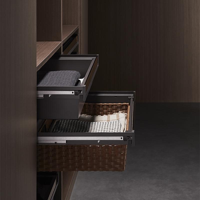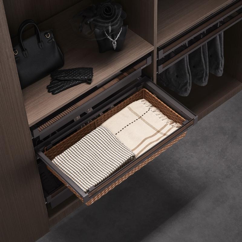 Полное выдвижение обеспечивает легкий доступ ко всем хранимым вещам, оптимизируя пространство гардероба.