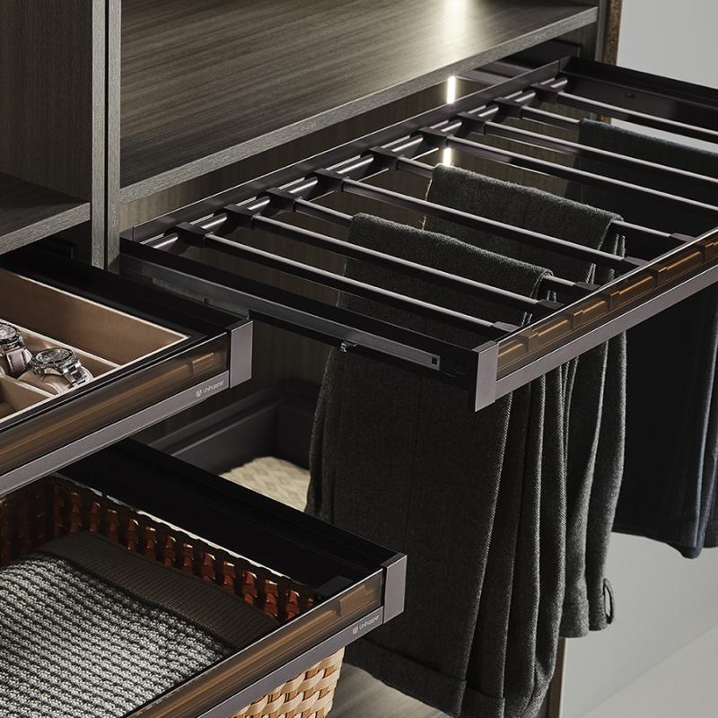 Полное выдвижение обеспечивает легкий доступ ко всем хранимым вещам, оптимизируя пространство гардероба.