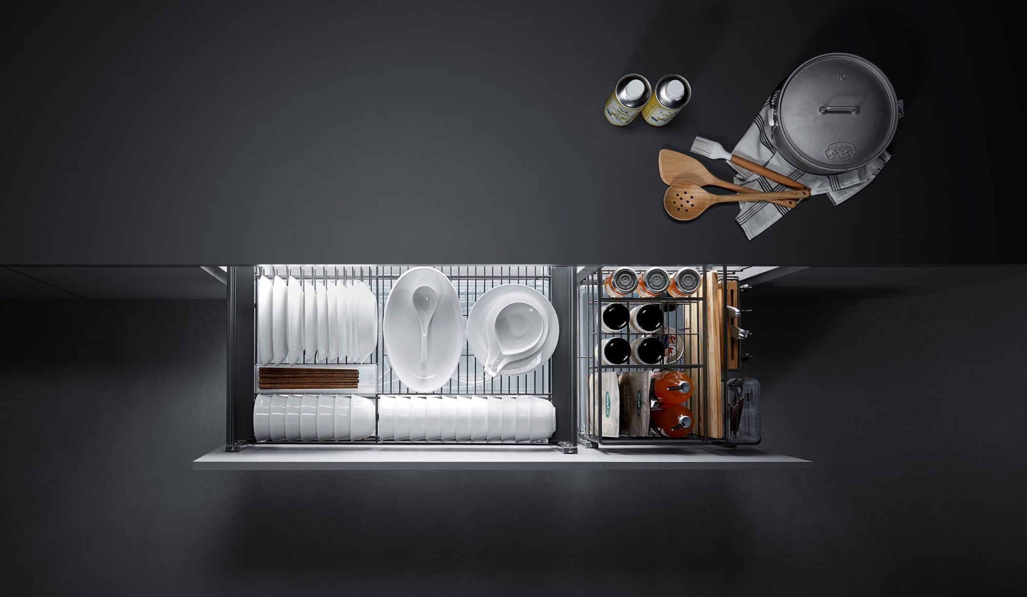 Корзины оснащены направляющими UNIHOPPER скрытого монтажа с бесшумным высококачественным доводчиком, обеспечивающим плавное и тихое выдвижение. Все сетчатые металлические части и окантовки полок имеют хромоникелевое покрытие увеличенной толщины или нанополимерное покрытие серого цвета. Это гарантирует их долговечность и устойчивость к коррозии, подтверждённую тестом в солевой среде.