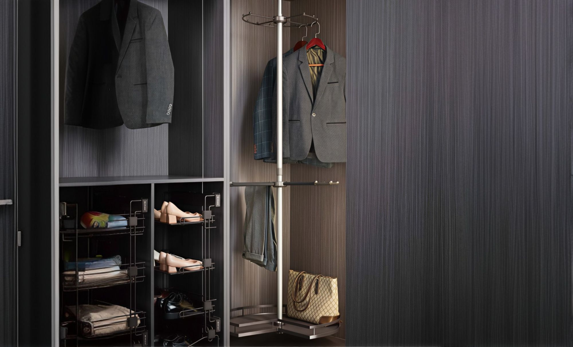 Полный обзор и легкий доступ к вещам с любой стороны. Идеально для угловой секции шкафа.